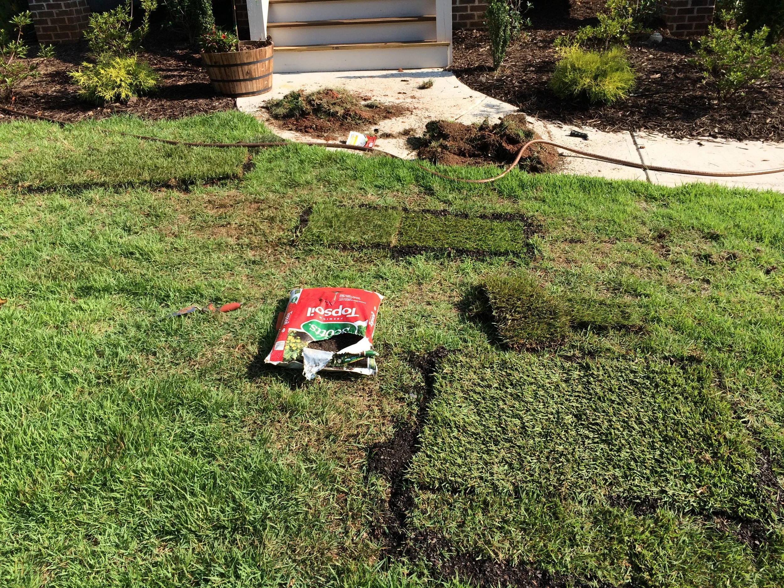 Sunday, when the alarm went off, I cursed that lawn but had to finish what I started. When I was done, just before our friends were to arrive, we had a Frankenstein-esque patchwork of a front lawn and I needed a long nap.